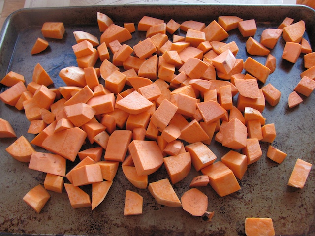 Directions: Preheat the oven to 400 degrees. Place the sweet potatoes on a cooking sheet and drizzle half the sunflower oil and toss. Roast for 20 -30 minutes, until tender.
