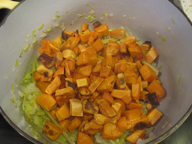 Add the cooked sweet potatoes, stock and tomato paste and bring to a boil. Reduce heat and simmer for 10 minutes or until the liquid has reduced and the veggies are all completely tender. Pour in the coconut milk and cook for another five minutes.