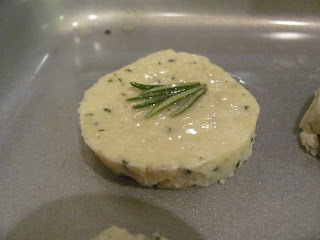 When you are ready to bake, preheat the oven to 325. Slice the crackers into 1/4 an inch slices. To attach the herbs, press the sage leaf or rosemary sprig into the top of the cracker and then brush with egg wash.